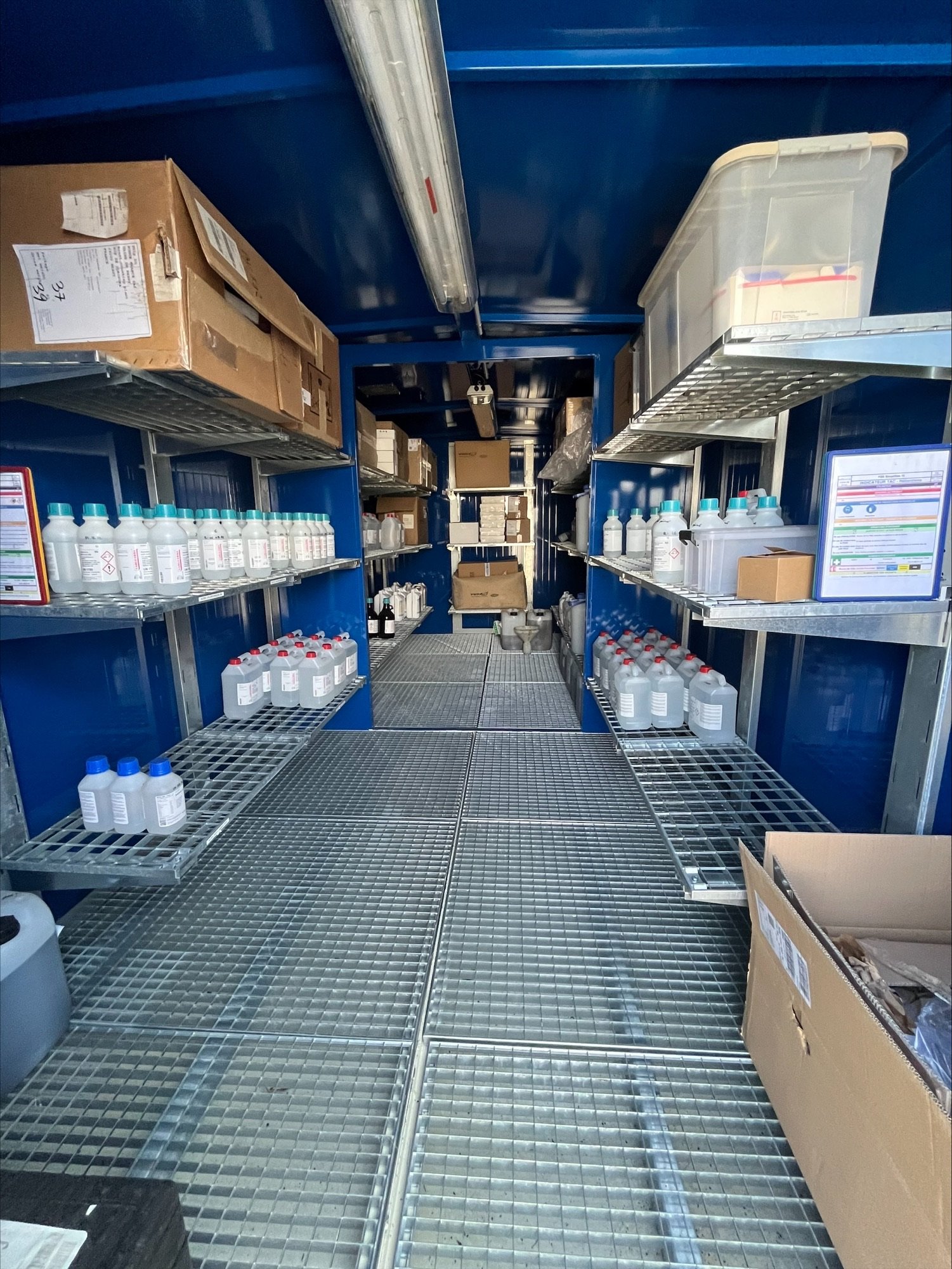 L'entreprise BUNGE a installé le bungalow sur une dalle de béton coulée au préalable pour une stabilité optimale. Les étagères ont été montées et les produits transférés de l'ancien conteneur au nouveau bungalow. L'électricité a également été branchée.